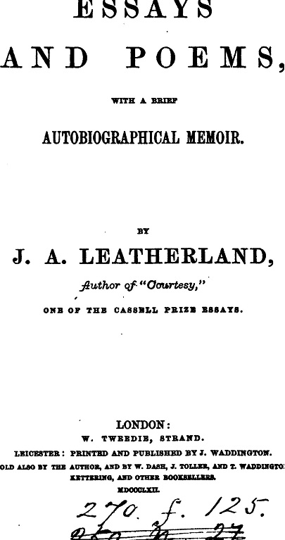 As well as his "Essays and Poems with a brief autobiographical memoir", J.A. Leatherland also wrote "Psyche : a prize essay on the immortality of the mind and the immorality of the soul etc", a 23 page booklet published by J Butterfield in Northampton (1853).